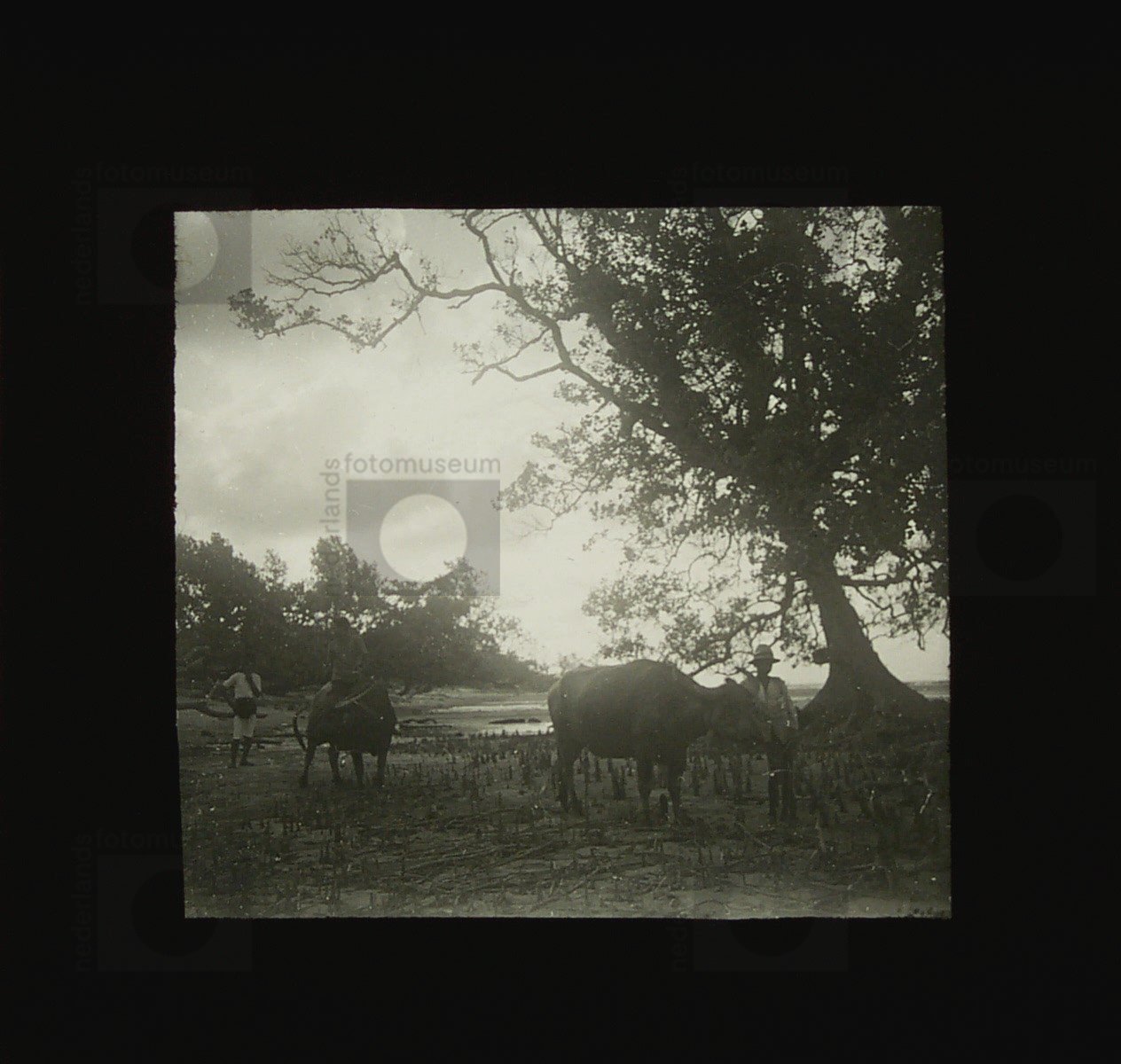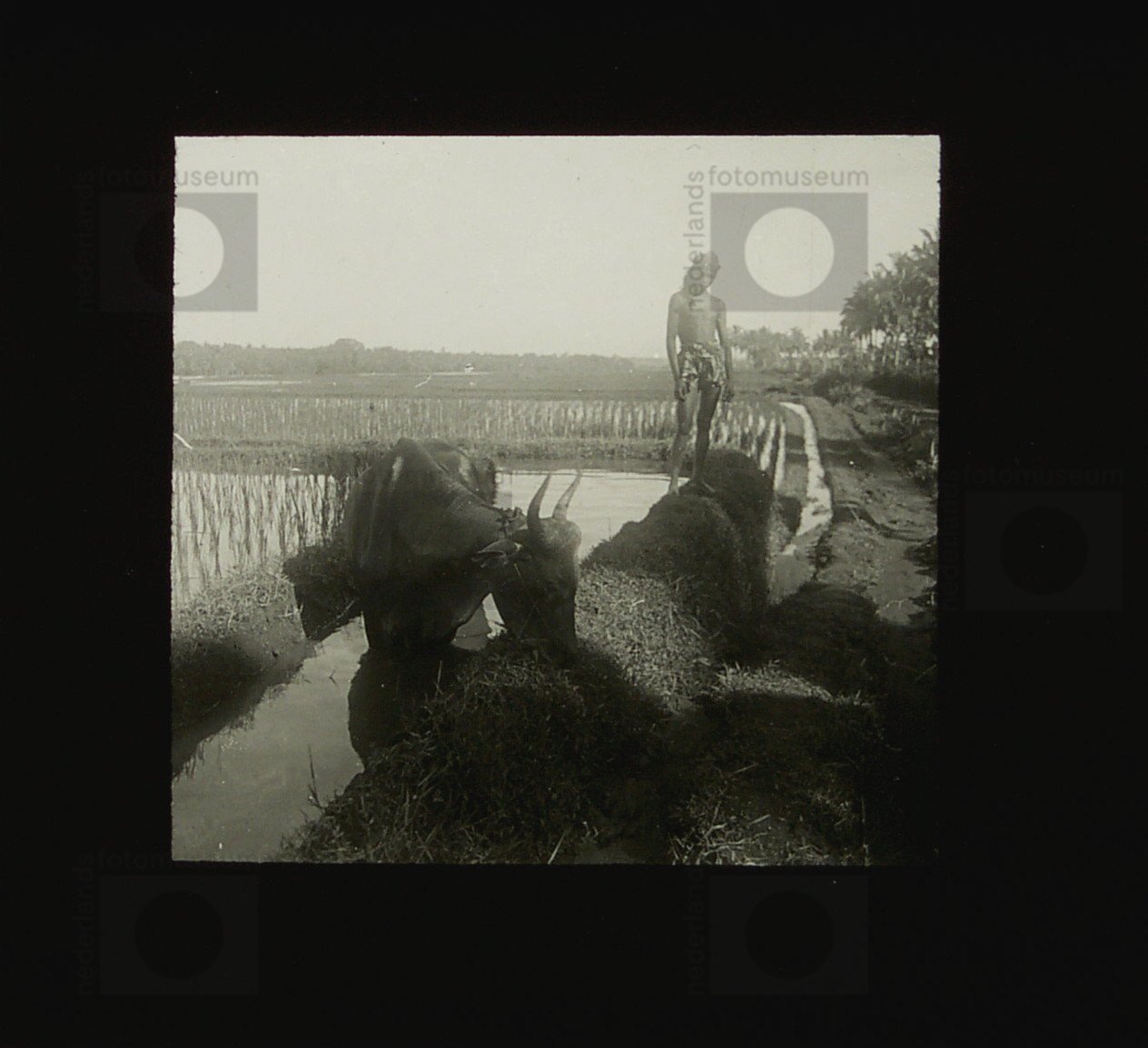 Waterbuffel in rijstveld, Bali, Indonesië (1912-1914)