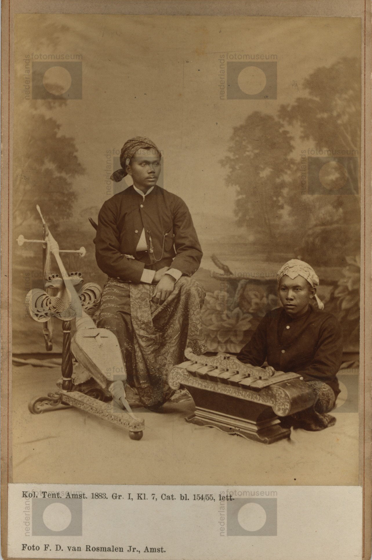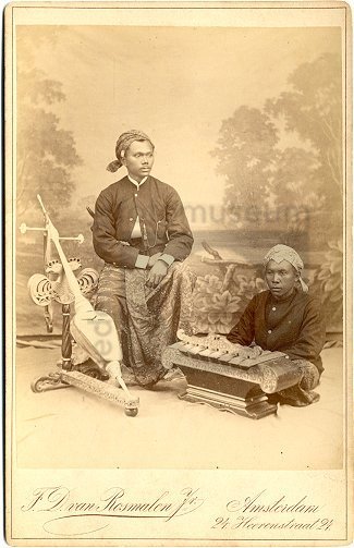 Sidin Ahoem met de rebab en Rimboe met een saron , K...