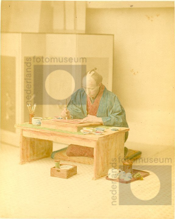 Vrouw calligrafeert een brief, Japan (1881-1914)