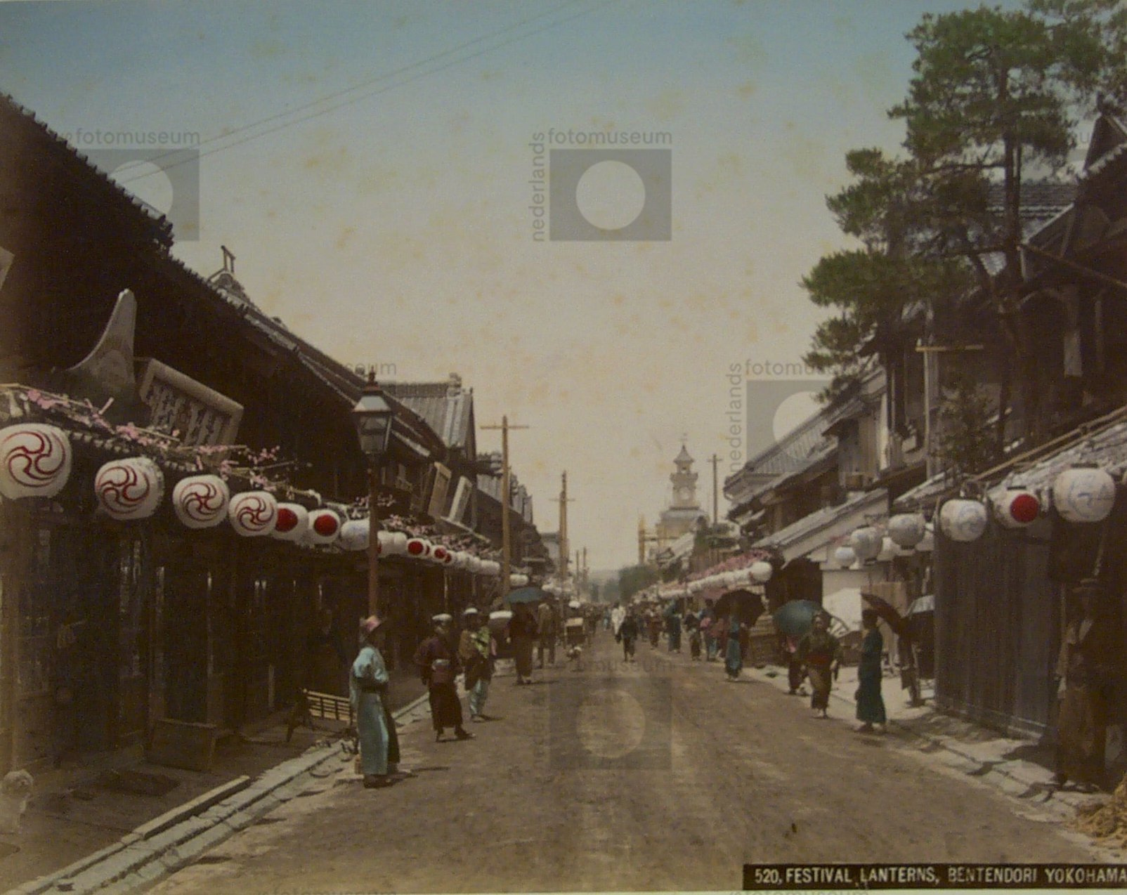 Straatbeeld met lantaarns, Yokohama, Japan (1881-1914)