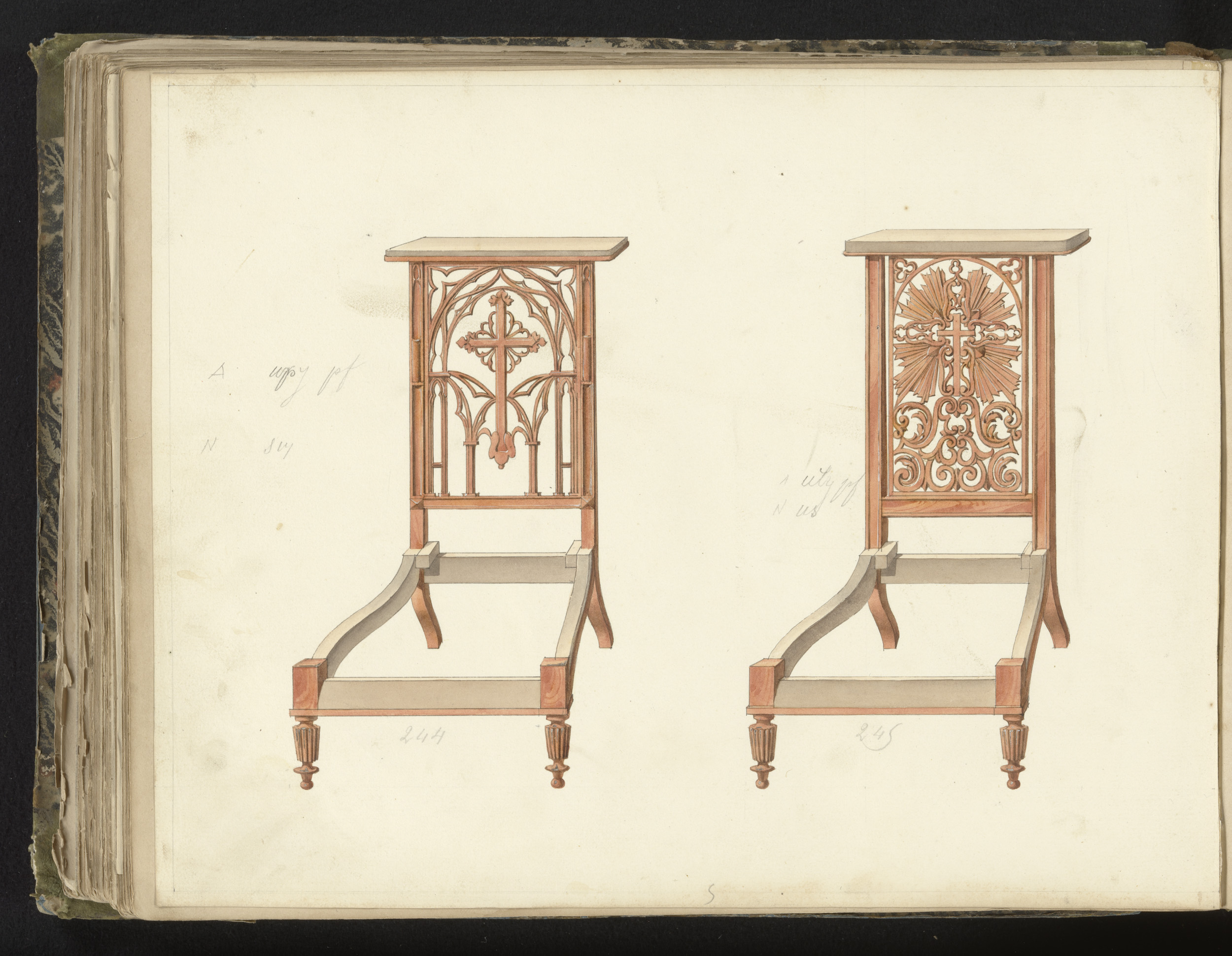 Drie ontwerpen, een muzieklessenaar, een vouwstoel e...