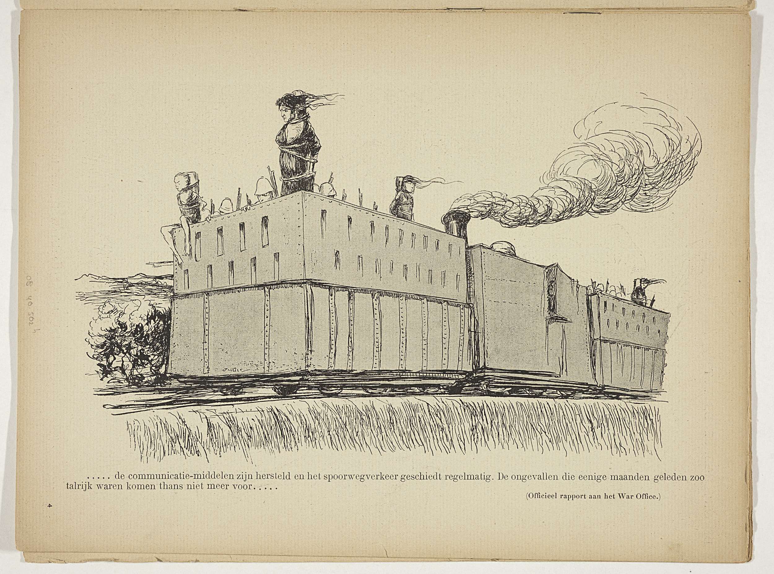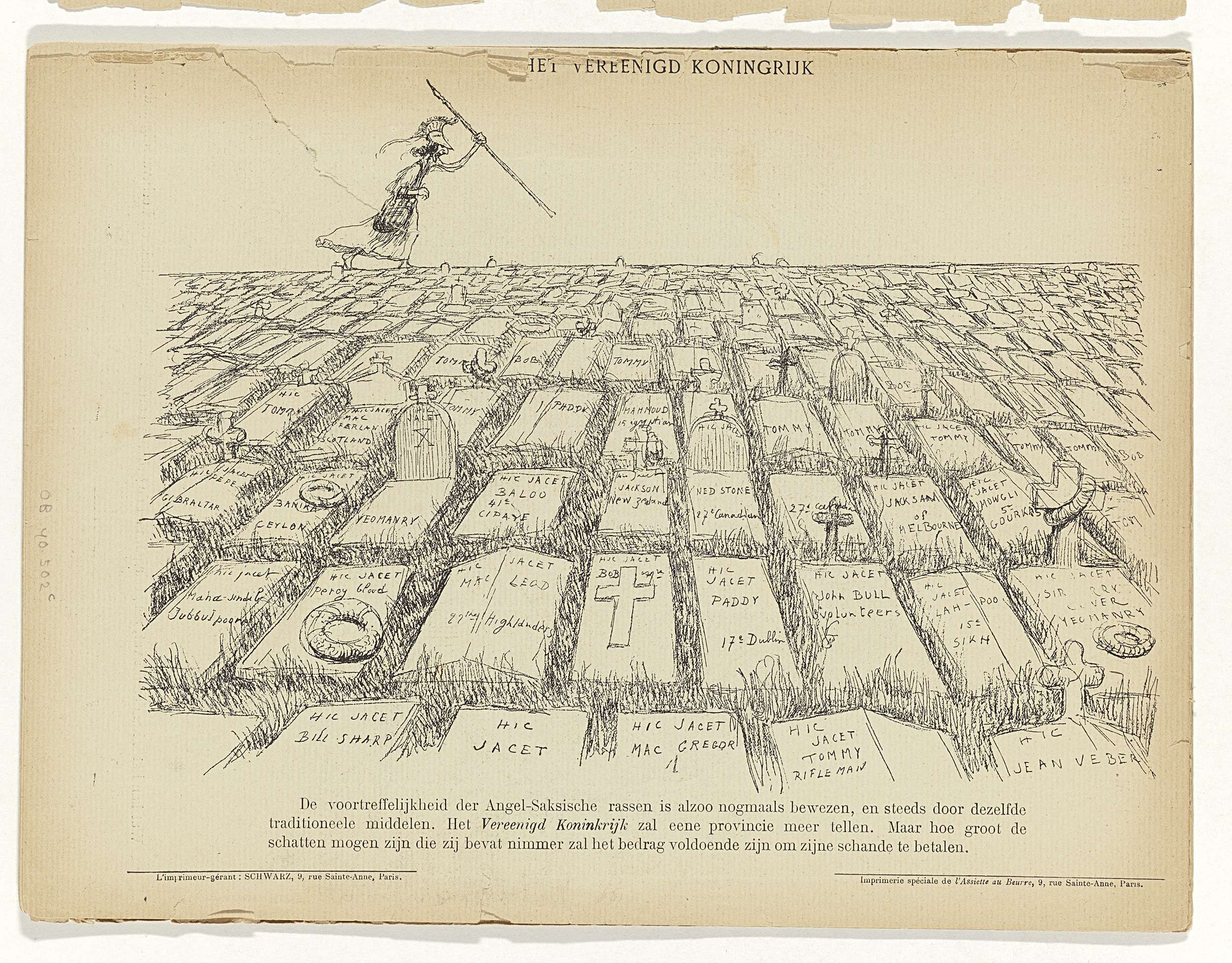 Vrouw met helm en speer (Oorlog) loopt over graven v...