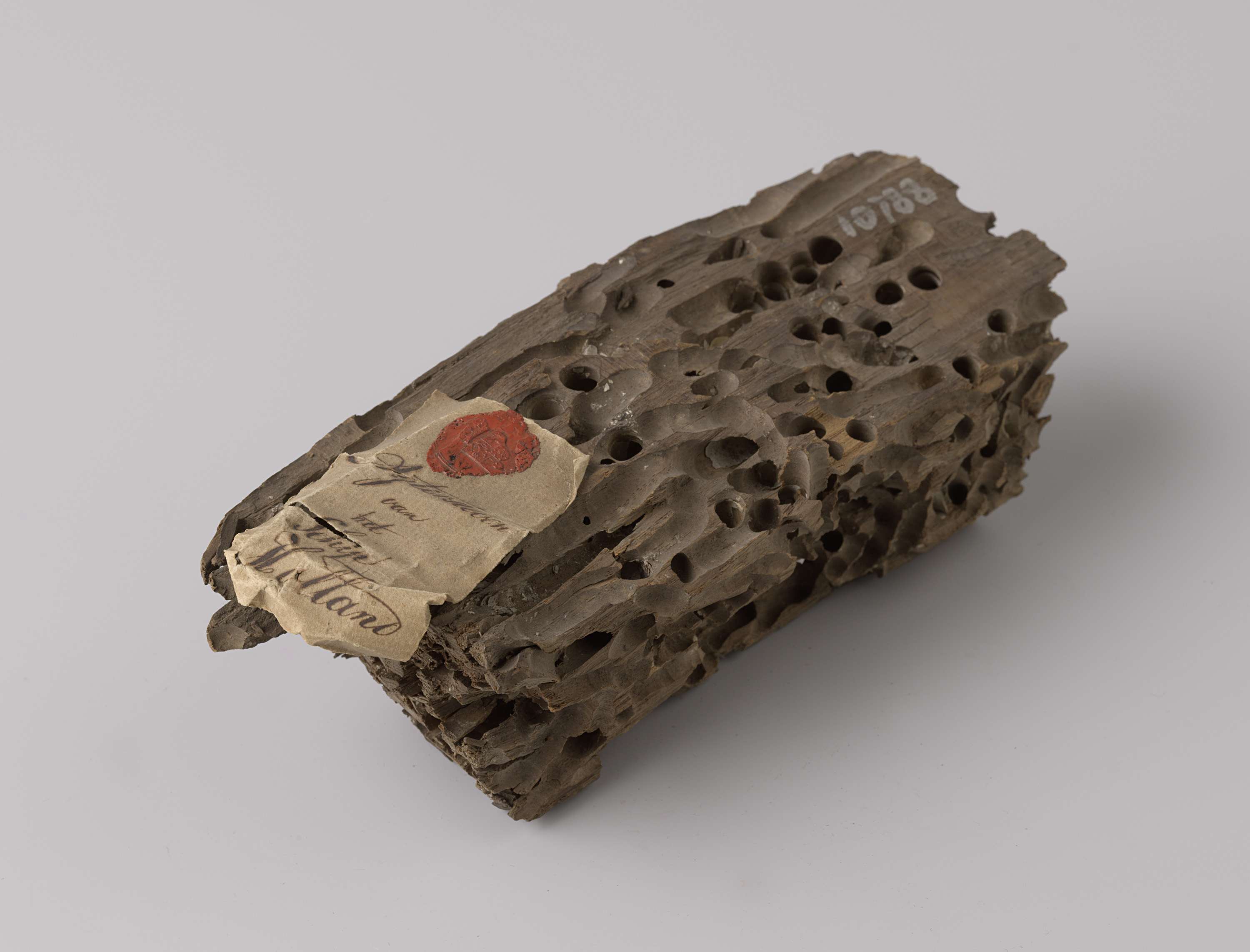 Houtfragmenten in concretie uit het wrak van de Oost...