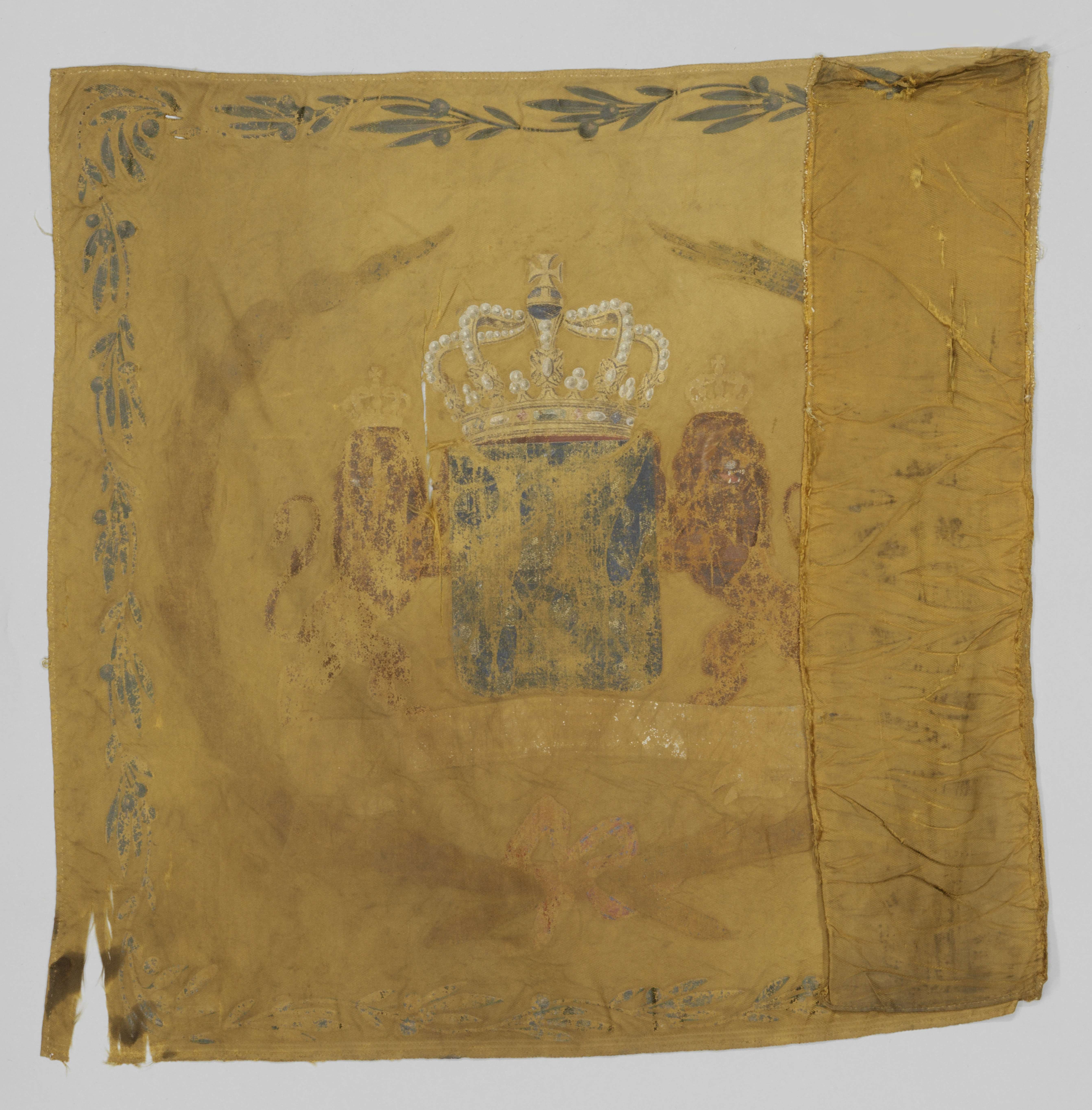 Fragment van geelcrème-kleurig vaandeldoek afgezet m...