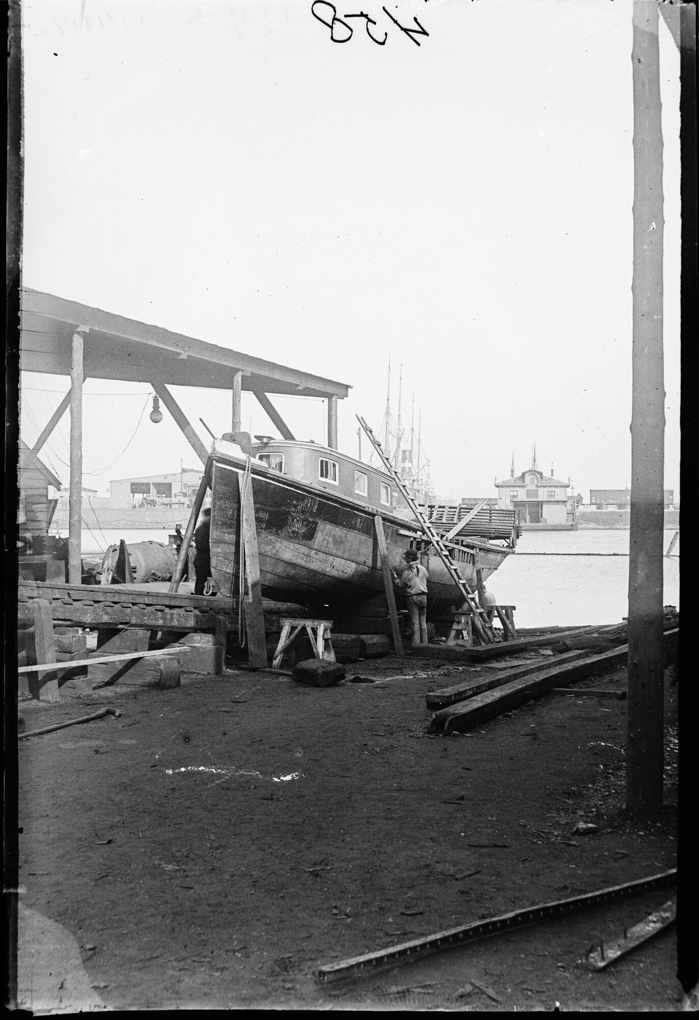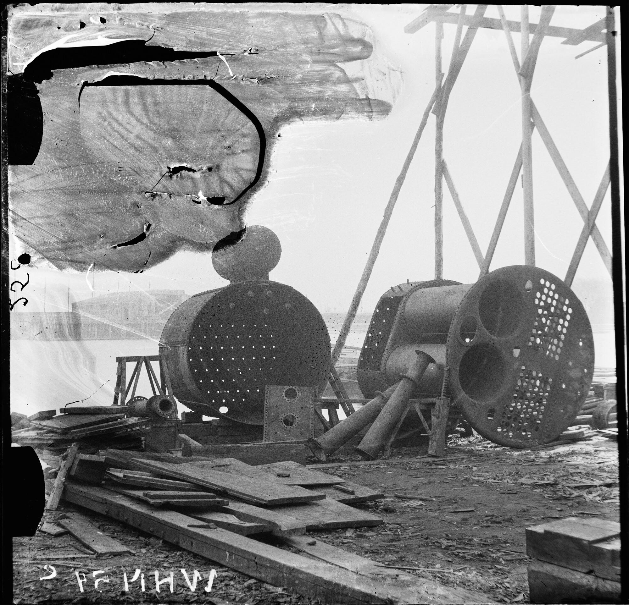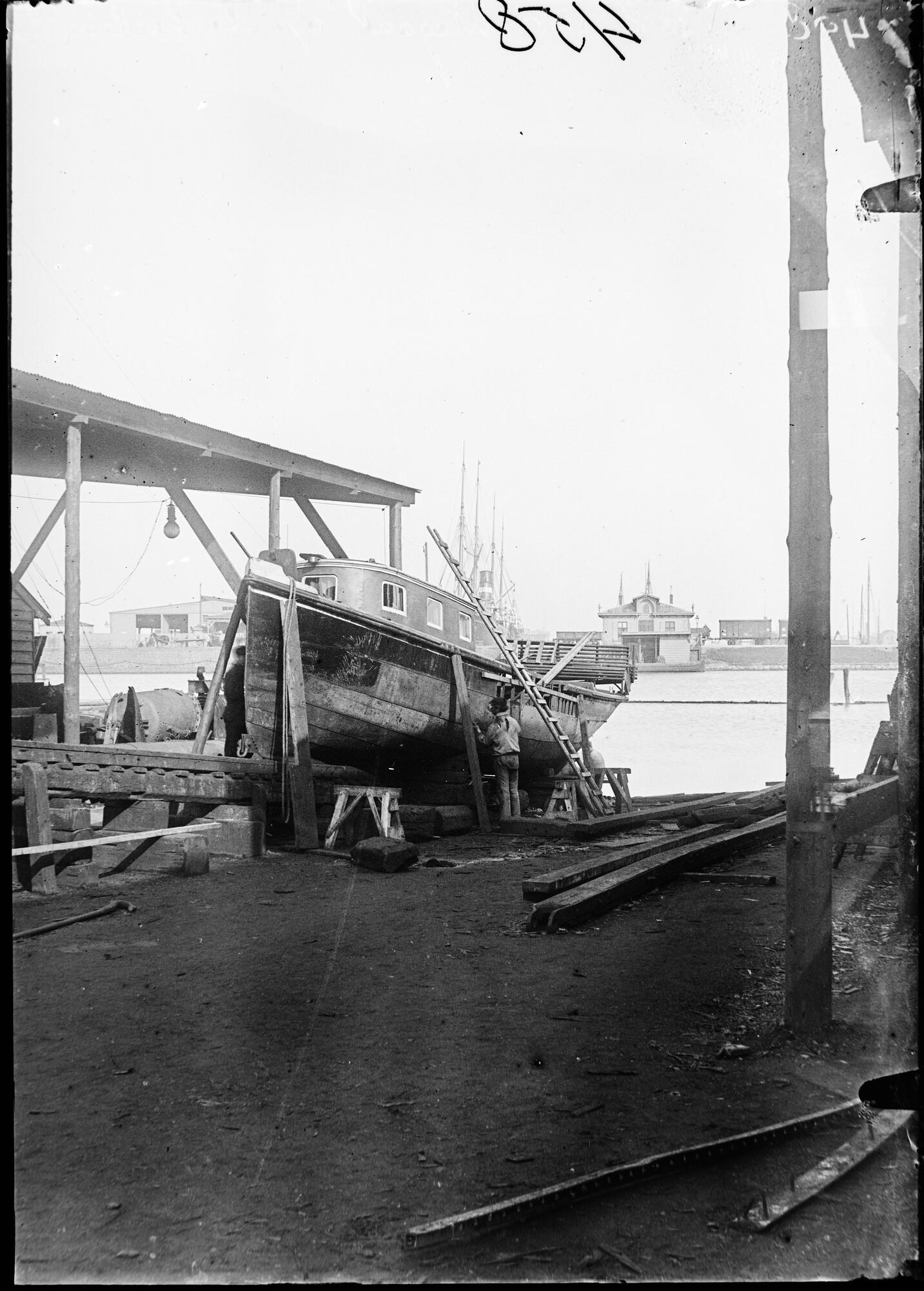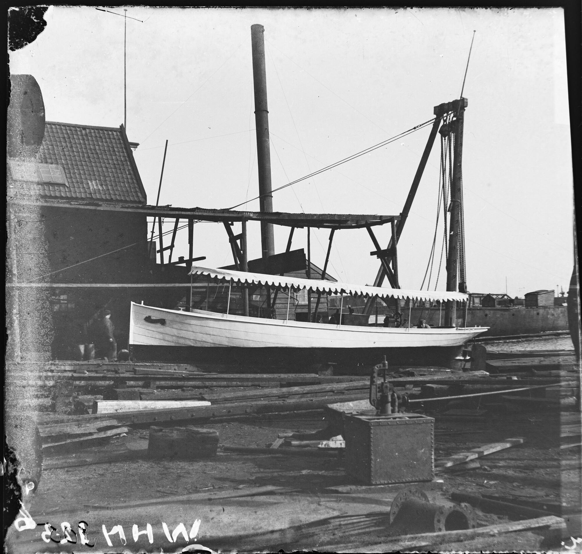 Glasnegatief van motorsloep Annie, in aanbouw op de ...