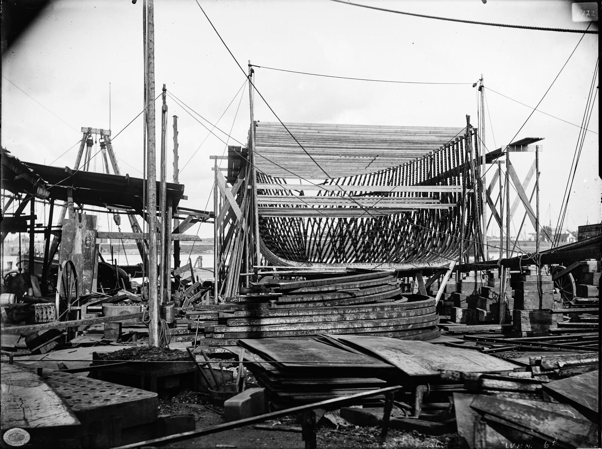 Het stalen barkschip Van Galen in aanbouw op de werf...