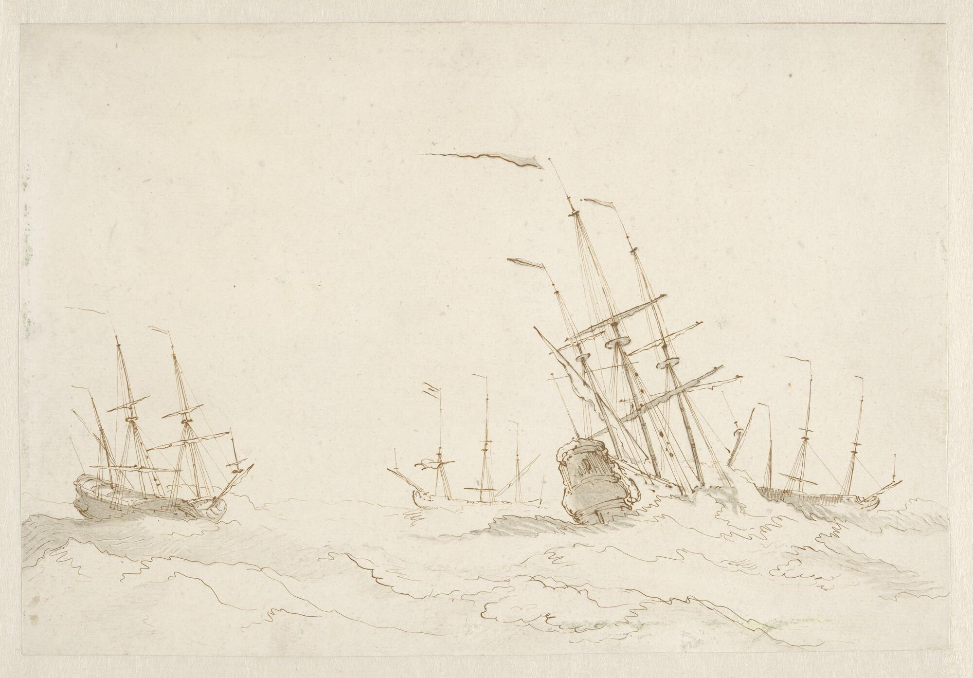 Vier oorlogsschepen in zwaar weer voor anker