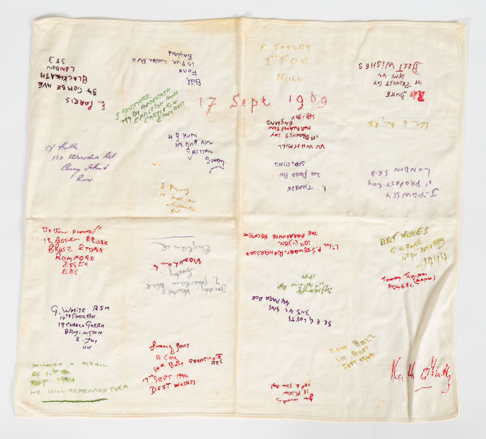 Witte doek met geborduurde handtekeningen van Arnhem...