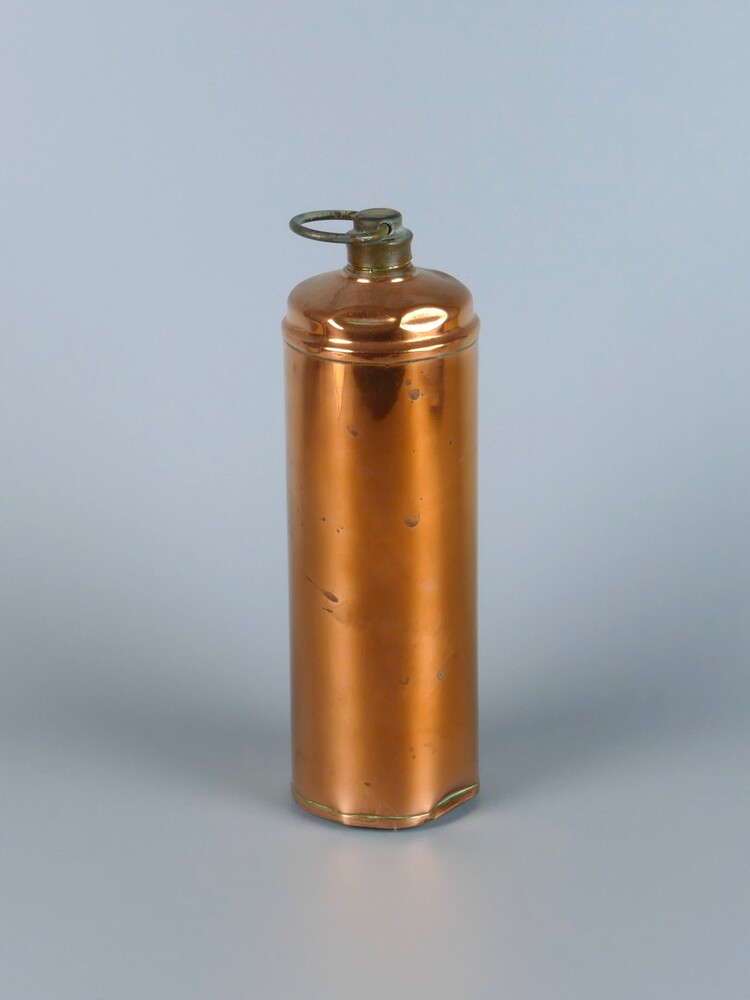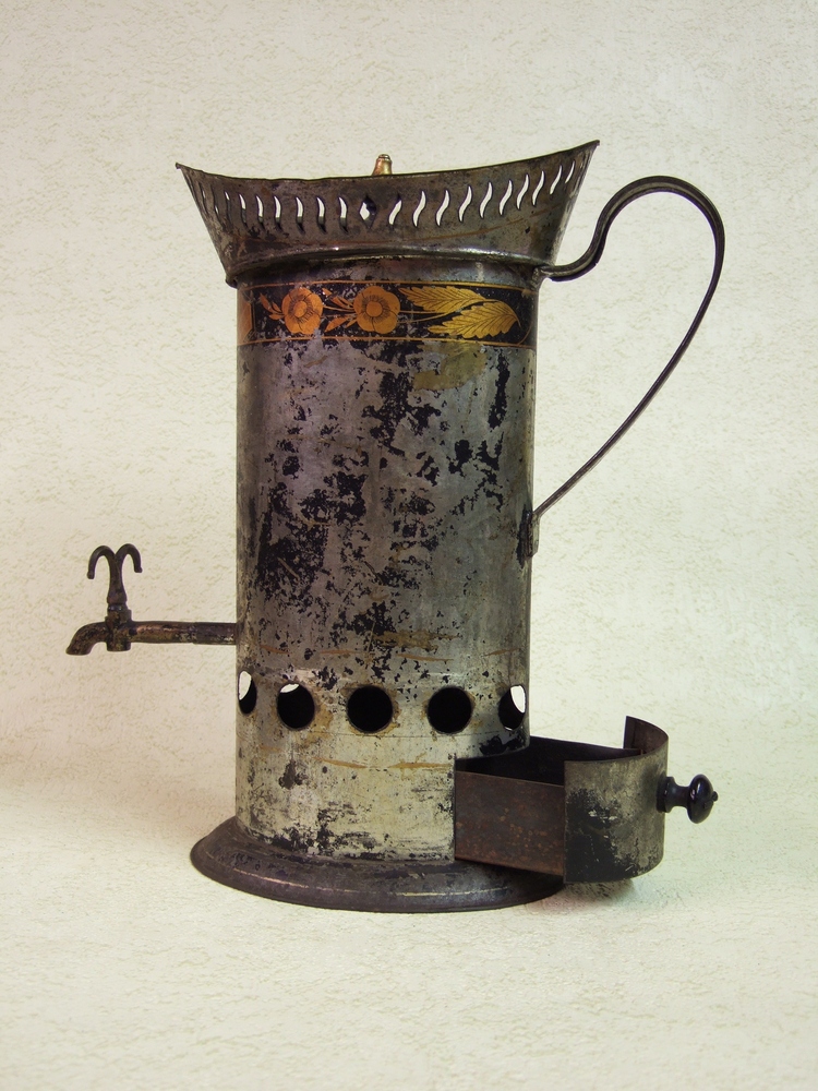 Kan met deksel, kraantje en schuifje voor kooltjes.