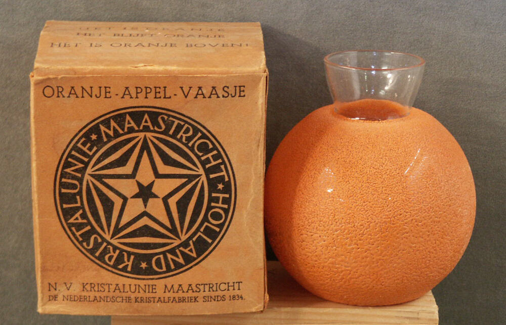 vaasje van kleurloos glas en oranje glazuur, in orig...