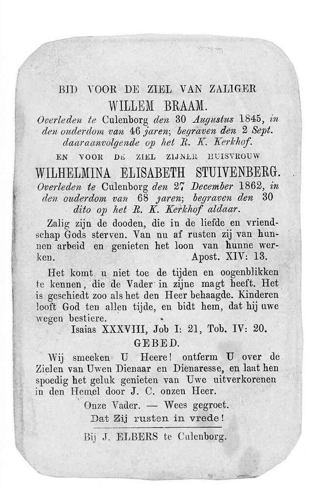 bidprent voor Willem Braam. Geboren 1799, overleden ...
