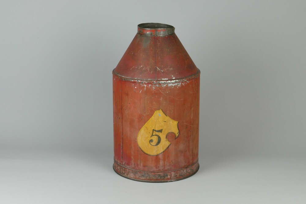 voorraadblik, rood gelakt met cijfer 5, circa 1900