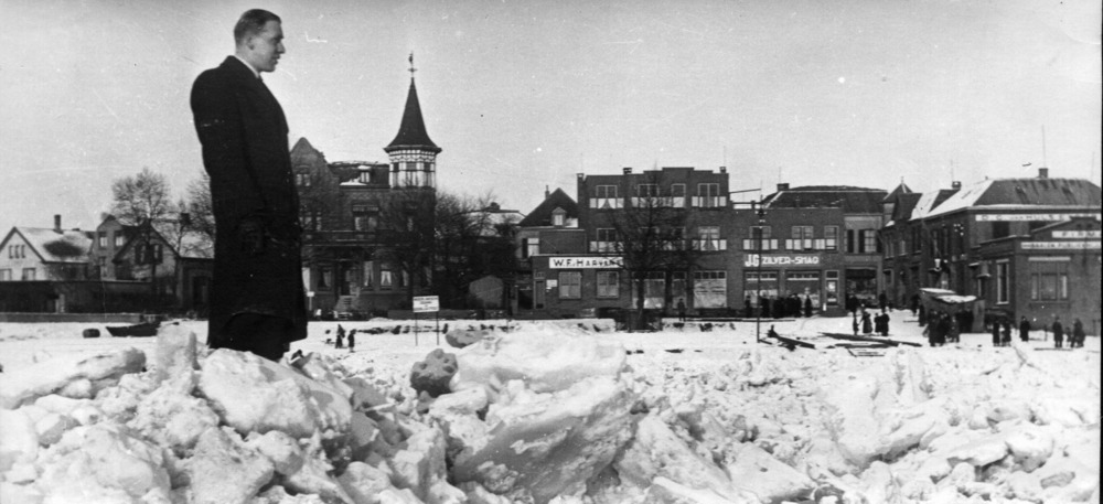Zwart-wit foto van ijsgang op de Rijn bij Tolkamer i...