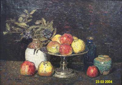 Stilleven met appelen, tinnen schaal, gemberpot en b...