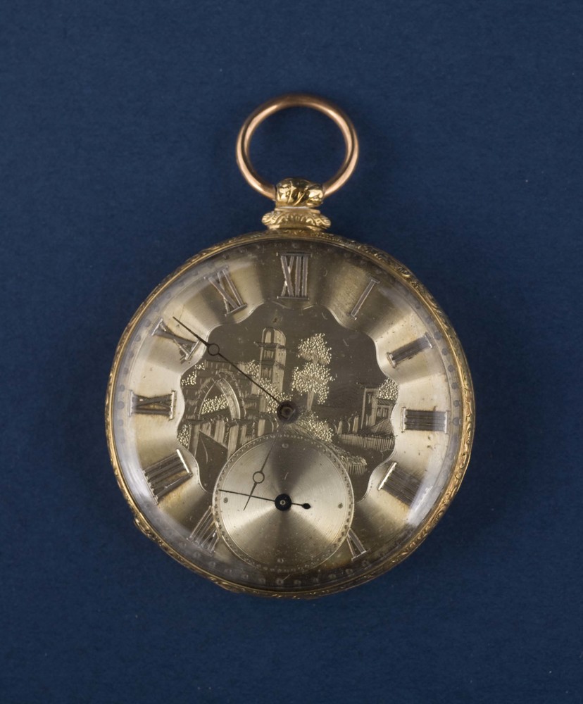 Horloge met kast van goud, met ingegraveerde voorste...