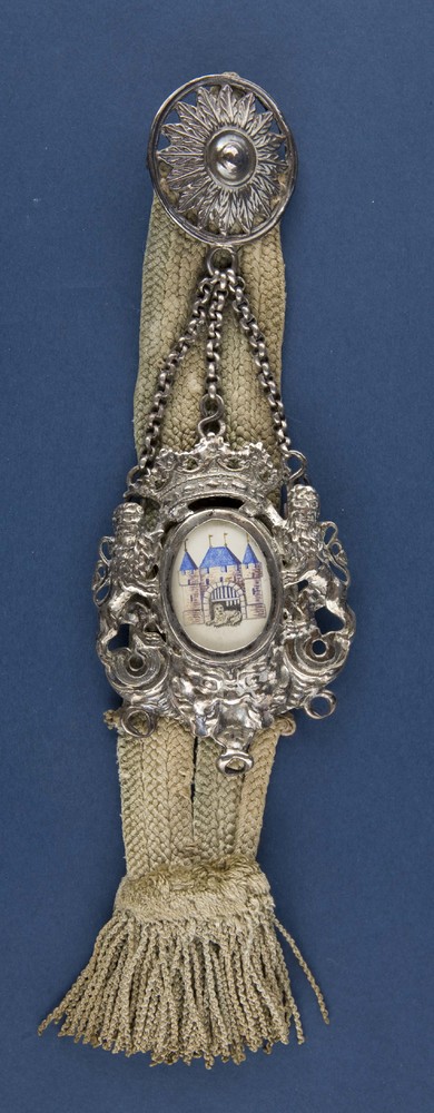 Gesp van zilver met merk, ter bevestiging op een sch...