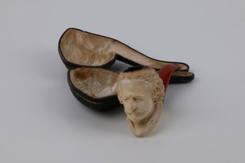 Meerschuim pijp in de vorm van een hoofd in foedraal