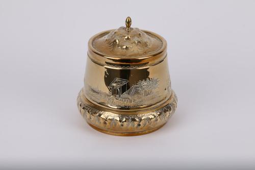 Messing tabaksdoos met gravure van dorps-/stadsgezicht
