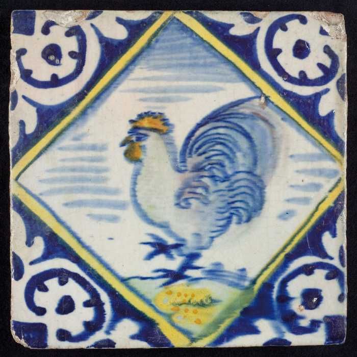 Dierentegel, veelkleurig, haan op grondje, hoekmotie...