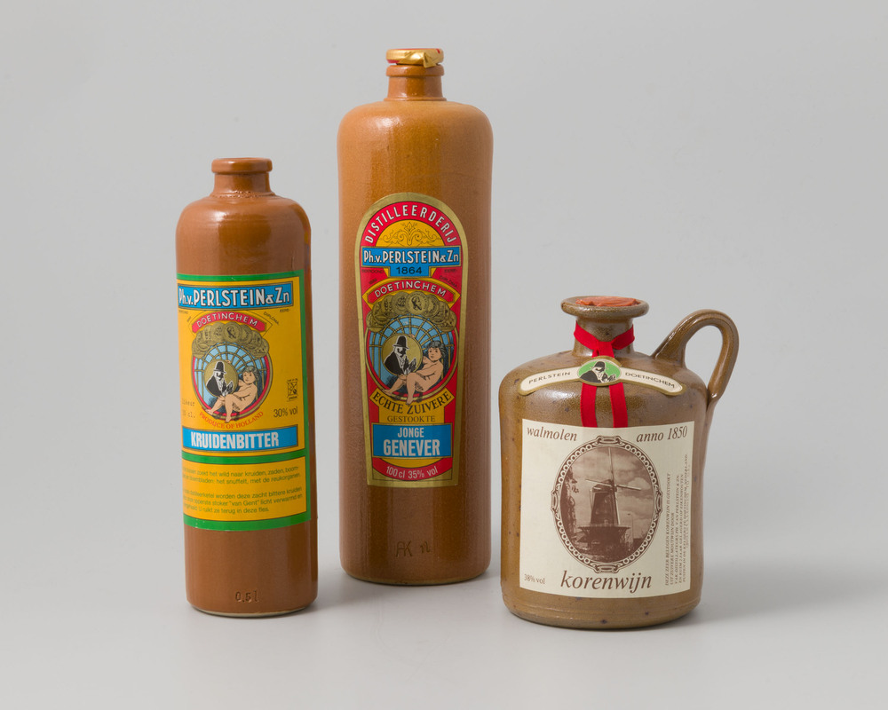 Krat, uit bruin hout, met 5 flessen van Perlstein