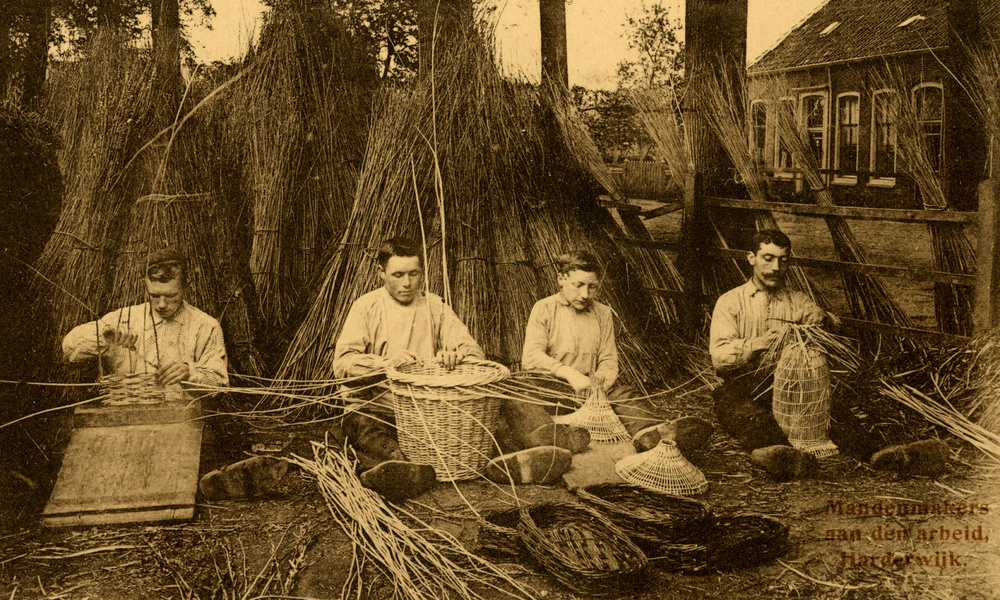 Prentbriefkaart, getiteld 'Mandenmakers aan den arbe...