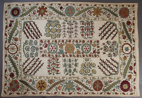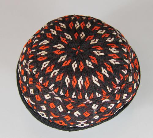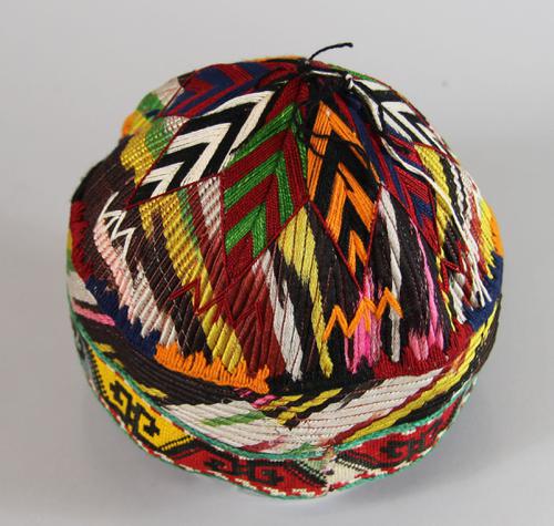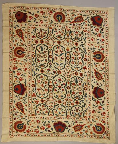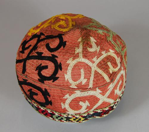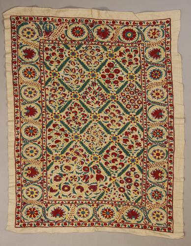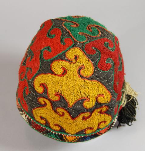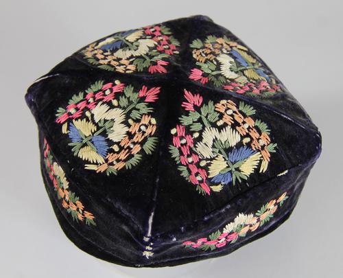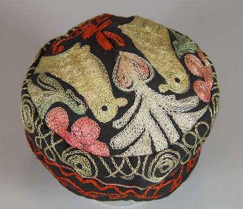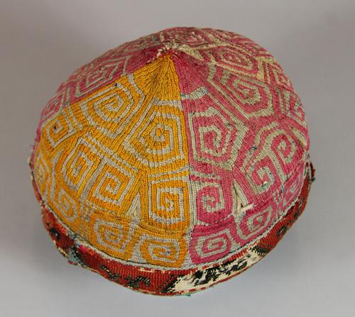 : Silk (ground and lining) with several types of metal thread; metal thread lace and plaited band and sequins; linen (interlining) (1)