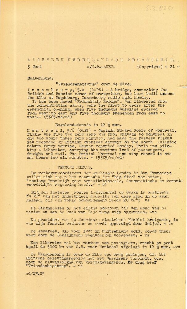 Algemeen Nederlandsch Persbureau, mededelingen, 26 m...