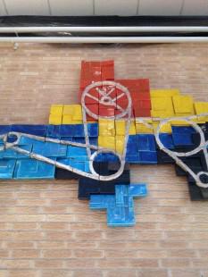 Door De Poceleyne Fles ‘in engobe-techniek en in reliëf. De engobe tegels zijn zeshoekig van vorm en met minimale voeg ingewassen’. (1)