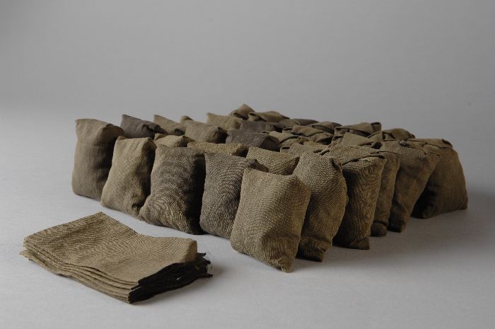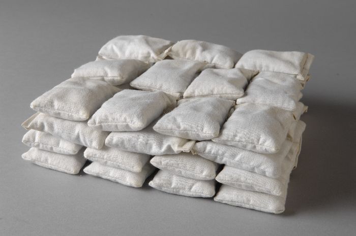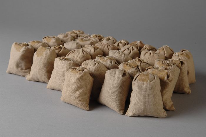 Zakken met aardappelen voor houten model van een vra...