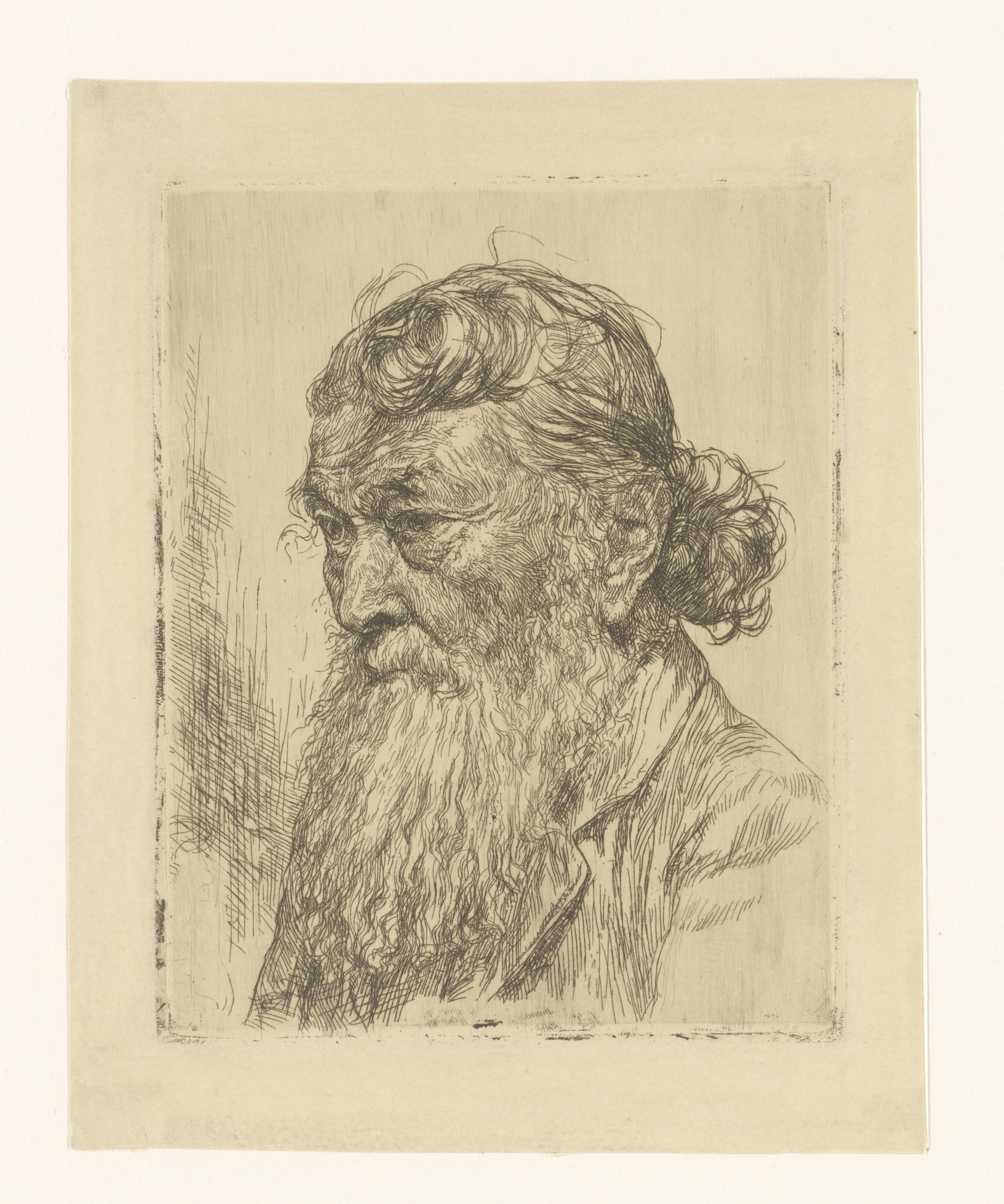 Hoofd van een oude man met baard en haar in een knot