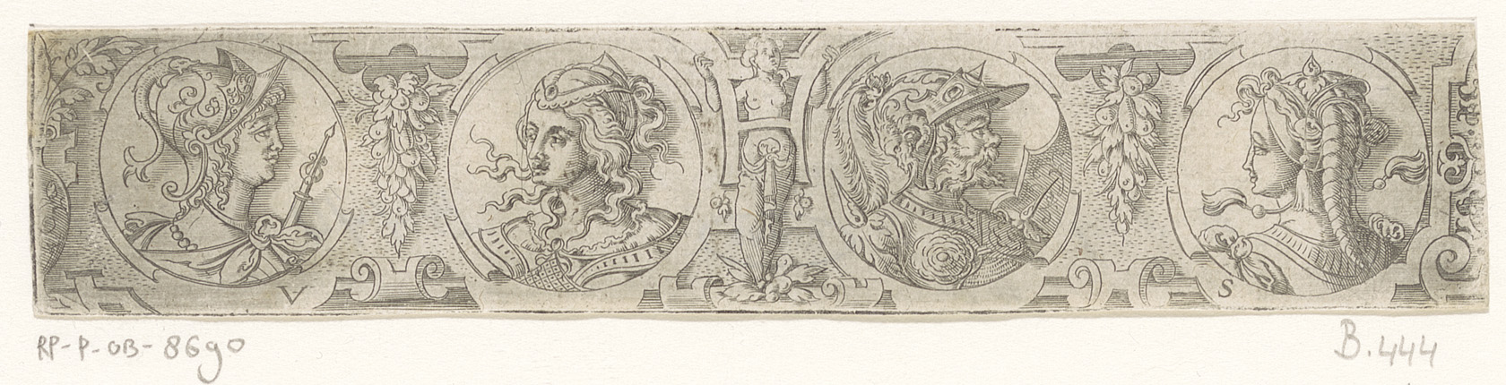 Fries met vier bustes in medaillons binnen een rolwe...
